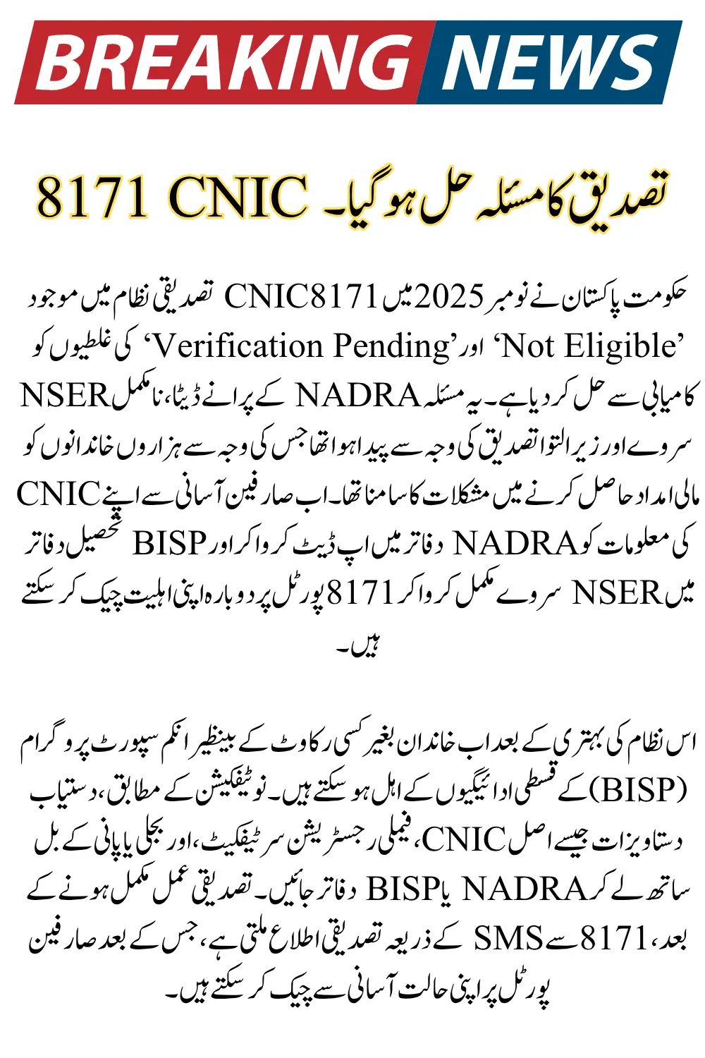 The ‘Not Eligible’ and ‘Verification Pending’ errors on the 8171 CNIC verification portal were a significant hurdle for many beneficiaries, but the November 2025 update has effectively addressed these challenges. Through simple steps involving NADRA updates, NSER surveys, and using official 8171 web and SMS services, families can now smoothly verify their eligibility and continue receiving their deserved payments without interruption. For assistance, always rely on official channels such as the 8171 helpline, NADRA offices, and BISP centers.