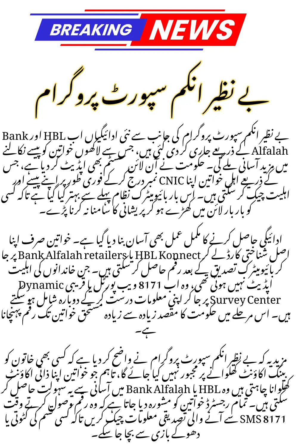 BISP 8171 payments via Habib Bank and Bank Alfalah are now live for December 2025. With the biometric-enabled withdrawal system, official BISP camps, and instant eligibility verification through SMS and portal, beneficiaries can safely collect their cash without delays or hassle. Always follow the official channels to ensure security and enjoy a smooth payment process.