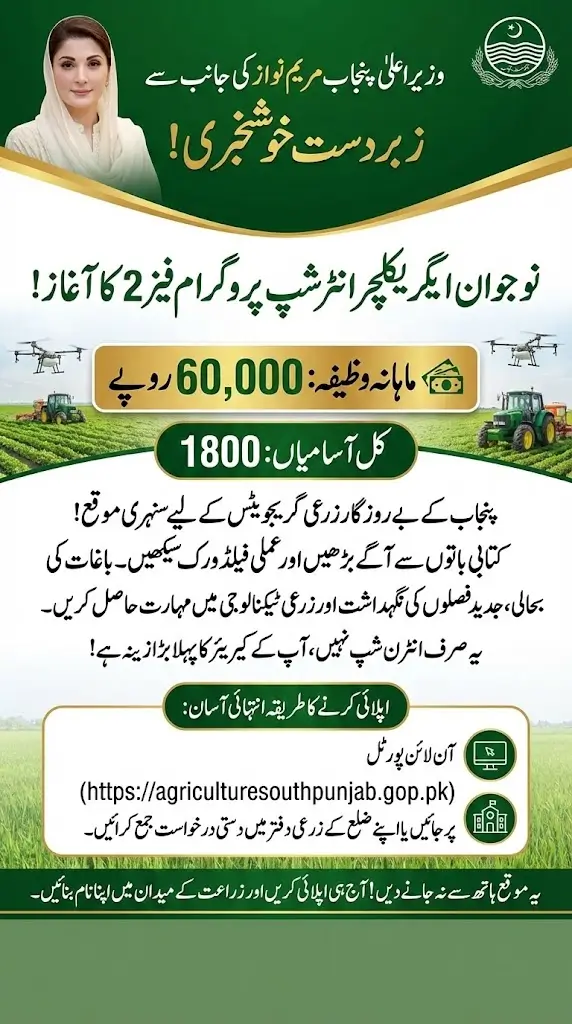 CM Maryam Nawaz has officially launched Phase 2 of the Naujawan Agriculture Internship Program, offering a massive Rs. 60,000 monthly stipend. With 1,800 seats available, this initiative is designed to bridge the gap between your degree and practical field success.