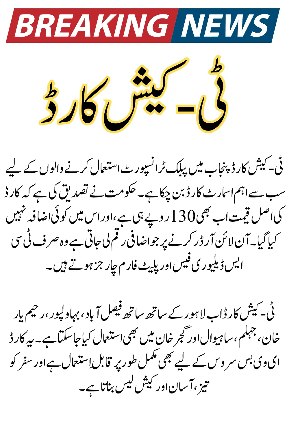 The T-Cash Card remains Rs. 130, and the additional charges only apply when ordering online for home delivery. As the system expands across Lahore, Faisalabad, Bahawalpur, Rahim Yar Khan, Sahiwal, Jhelum, Gujar Khan, and Bahawalnagar, the card is becoming essential for daily travel.