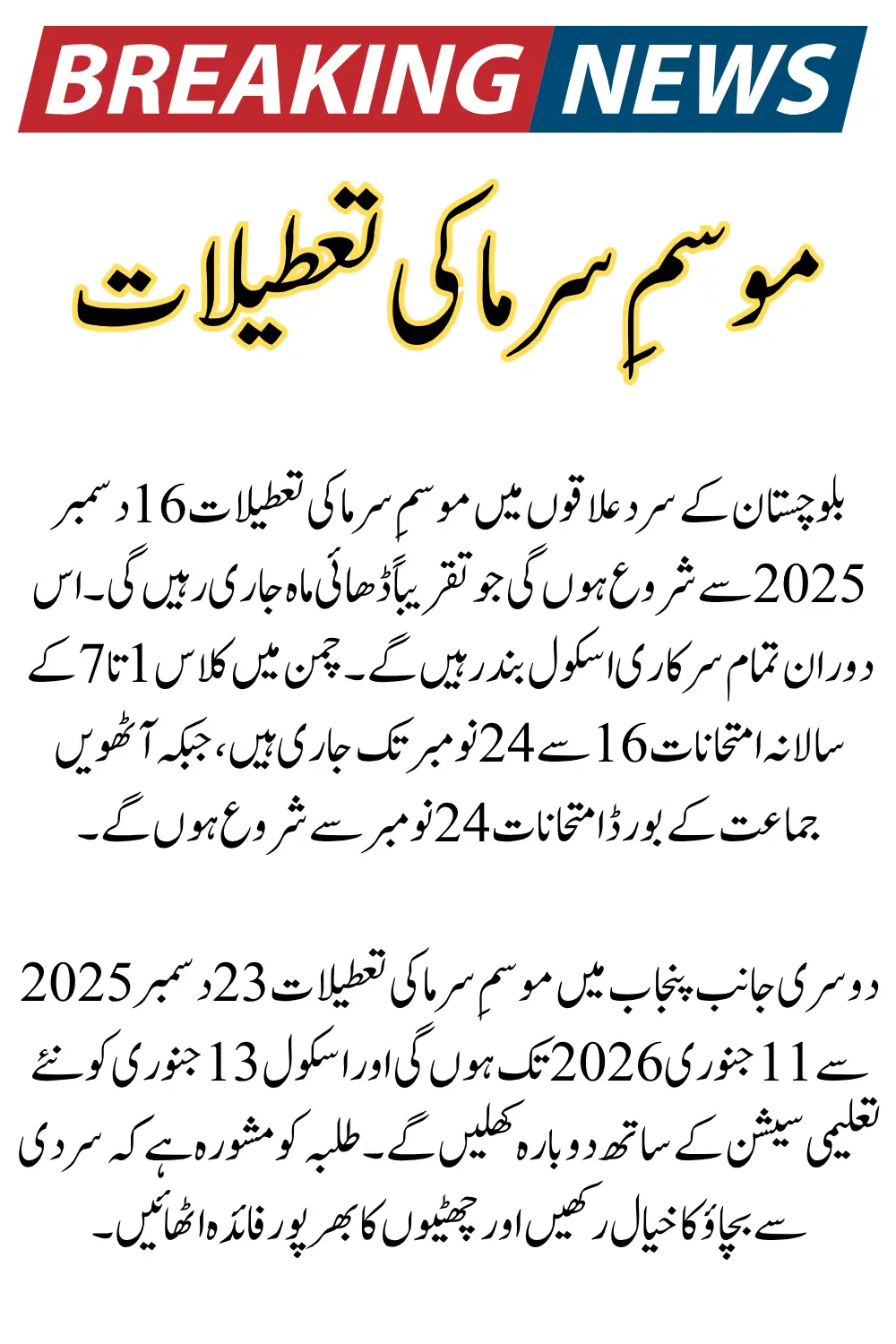 This is a very positive update for students in both Balochistan and Punjab. Students in Balochistan should focus on completing their exams, while students in Punjab can begin preparing for their winter break activities.